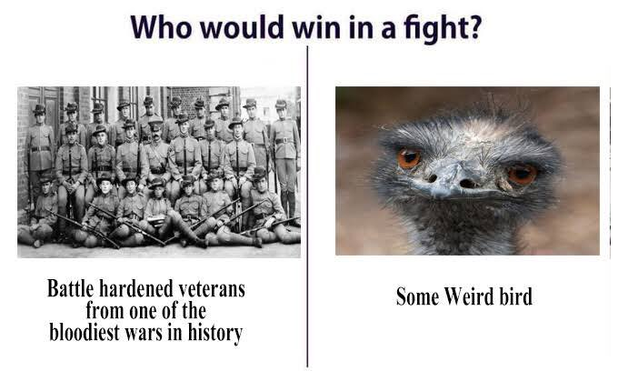 На деле вышло не так эпично, надо признать. Вся армия состояла из майора Мередита и двух солдат, вооружённых пулемётами Льюиса и 10 тысячью патронами. По мнению командования, это должно было помочь как-то проредить отряды эму до приемлемых в нормальном обществе размеров. Ну и заодно показать заботу страны о своих гражданах. Фермеры, вроде как успокоились, достали попкорн, чтобы любоваться, как грёбаные пернатые будут гибнуть под градом пуль и изредка ловить флешбэки на тему военного прошлого. Но у эму были совершенно другие планы на эти сражения. 2 ноября 1932 года в день, который с тех пор считается началом войны, солдаты нашли стаю из 50 особей, и майор приказал группе поддержки из фермеров гнать пернатых прямо на пулемёты. Противник на эту военную хитрость не купился и просто бросился в разные стороны. Результат — аж две раненые птицы. Которые тоже куда-то убежали помирать.