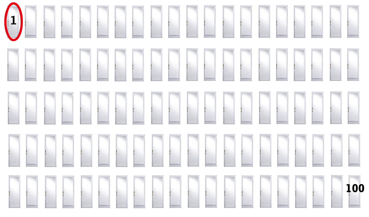 Во-первых, давайте договоримся, что ведущий всегда знает, где у нас автомобиль. Во-вторых, он всегда предлагает поменять дверь. Ну, и наконец, для наглядности, увеличим количество дверей, до хотя бы сотни. Итак, вы выбрали дверь под номером 1 (в кружочке). Шансы, что мы просто угадали дверь, за которой спрятан автомобиль — 1 из 100. Маленький, согласен. Теперь ведущий открывает все оставшиеся двери за которыми спрятались козы, кроме одной (то есть 98 дверей). И у нас на выбор опять остаётся две двери. Ту, которую выбрали мы, и та, которую оставил закрытой Монти (пусть она будет под номером 100). Как повести себя в этой ситуации? Как мы договорились, Монти у нас честный и он всегда знает, за какой именно дверью прячется автомобиль. Вспомним, что шанс того, что мы выбрали правильно — 1 к 100. А вот шанс того, что Монти выбрал правильно — 100 к 100 — он же обладает знанием, где находится главный приз. То есть коза за оставленной им дверью может быть только в том случае, если мы при первом выборе выбрали дверь с автомобилем. Следовательно, сейчас, при смене двери, шанс получить автомобиль 99 из 100. И если мы поменяем свой выбор, то именно с этой вероятностью получим автомобиль. Нет, как я уже сказал, он не будет гарантирован (всегда есть 1%, что нам очень повезло и мы выбрали верно в первый раз). Но он будет очень и очень велик, явно больше, чем в первом случае. Теперь вернёмся к нашим трём дверям. Тут уже цифры будут поменьше, но общая идея останется. Шансы, соответственно, будут 1 к 3, если мы продолжаем настаивать и 2 к 3, если поменять дверь. Небольшой, но приятный бонус к вероятности. Надеюсь, что это объяснение вам помогло и немного пощекотало нейрончики. Теперь перейдём к более мозголомному парадоксу.
