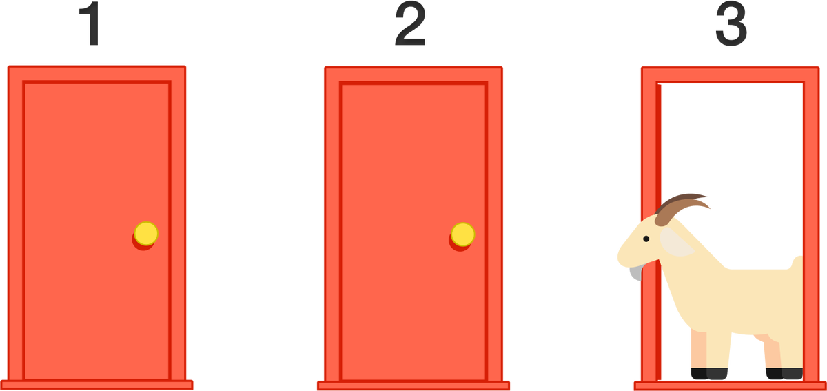 Сама задача была довольно простой. Итак, ведущий Монти Холл, в честь которого и названа задачка, предлагает игроку три двери. За одной — ааааавтомобиль. За двумя другими — козы. Ведущий знает, где эти самые козы расположены. После того как участник выбирает дверь, Монти открывает одну из невыбранных и показывает, что за ней коза. Ахахахаха!!! Коза! После этого он предлагает игроку поменять свой выбор игроку. Теперь задача: имеет ли смысл менять свой выбор? И решение здесь крайне неочевидное для мозга, который в процессе эволюции привык мыслить категориями «не выходи из зоны комфорта, не совершай ошибку». Ведь с позиции обычного человека, кажется — я сделал свой выбор, мне показали, что одна из невыбранных мною дверей — проигрышная. Но для меня то ничего не изменилось, ведь эта информация не касается «моей» двери. Так? Нет, не так. Ведь на самом деле, эта, казалось бы, не относящаяся к выбору информация — критически важна. И если её учесть при выборе (то есть поменять дверь), то шансы на победу значительно увеличатся. Тут просыпается та часть нашего мозга, которая ещё что-то помнит про теорию вероятностей и говорит что-то вроде: «ну, да, теперь у нас осталось две двери — это 50 на 50». Шансы, что я выбрал верную дверь, даже увеличились. Но нет. Шанс на правильный выбор для нас остался прежним. Как так? Предлагаю простой вариант решения, который подойдёт даже для не математиков.