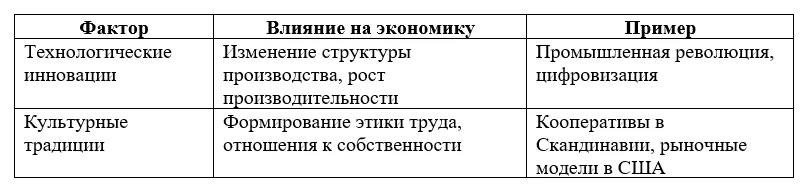 Технологии и культура играют ключевую роль в формировании и эволюции экономических систем, определяя их характер и направление развития. Технологические инновации изменяют способы производства, создают новые отрасли экономики и трансформируют существующие отношения между участниками экономической деятельности. Появление механизации, электричества, информационных технологий и искусственного интеллекта стало катализатором изменений, которые разрушали старые модели и давали начало новым. Так, индустриальная революция преобразовала аграрные общества в промышленно ориентированные, а цифровая революция стимулировала развитие глобальных рынков и сетевых структур.